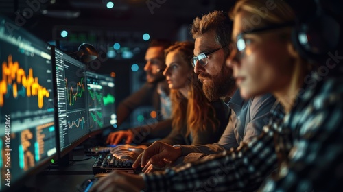 © Pat J., Obraz premium Group of data analysts examining a dataset, with graphs and charts on monitors
