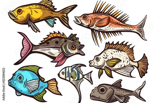 Naklejka premium Group of different types of fish on a plain white background. Ideal for...