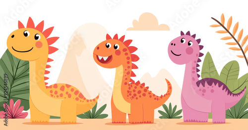 Obraz premium Group of dinosaurs, ancient volcanic landscape, friendly expressions, pastel tones