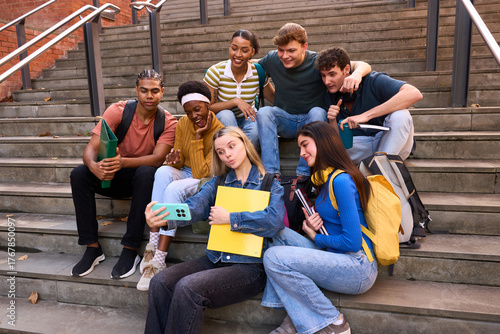 Obraz premium Group of diverse college students taking selfie on campus stairs