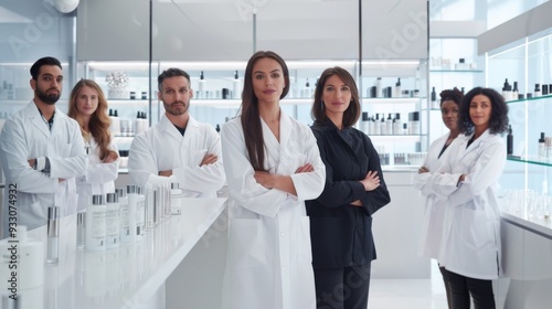 Fototapeta premium Group of diverse, confident scientists in lab coats, standing proudly in a...