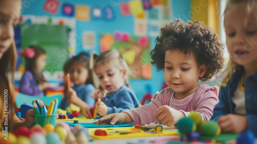 Fototapeta premium group of diverse creative children playing in the classroom with art blocks and colors
