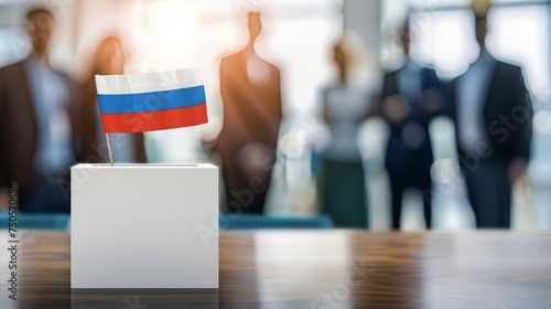 © tashechka, Obraz premium Group of diverse people gathered around a table with a small flag placed on it