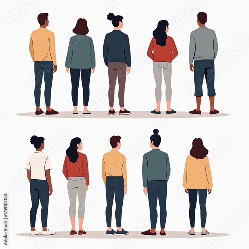 Obraz premium Group of diverse people stand together viewed from back. Casual fashion shows males and females in various poses and outfits. Diverse crowd gathered, facing away.