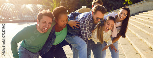 © Studio Romantic, Fototapeta premium Group of diversity friends walking together on street. Portrait of multiracial young male and female friends having fun outdoors. Joyful people posing together smiling at camera