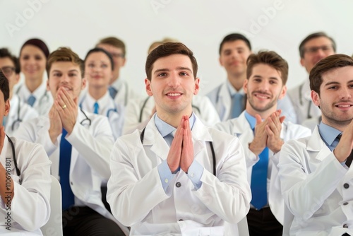 Fototapeta premium Group of doctors are clapping and smiling at a presentation. Scene is...