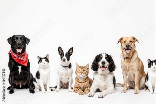 Fototapeta premium Group of dogs and cats sitting in a row against a white background