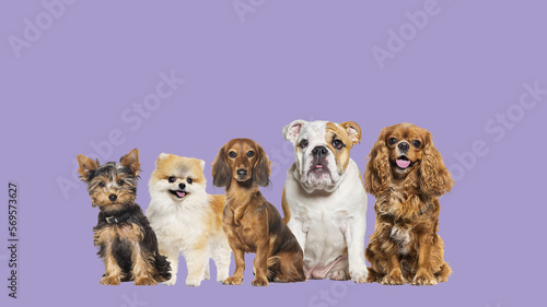 Obraz premium Group of dogs of different sizes and breeds looking at the camera, some cute,...
