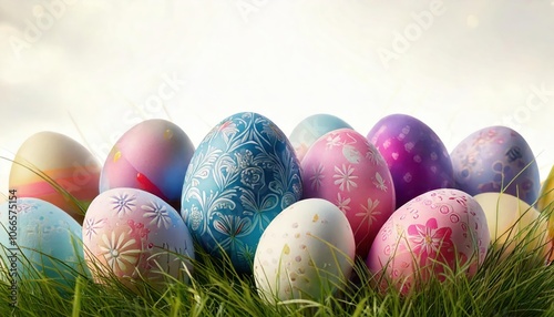 © blackdiamond67, Naklejka premium Group of easter eggs painted on white background Easter background 3D rendering