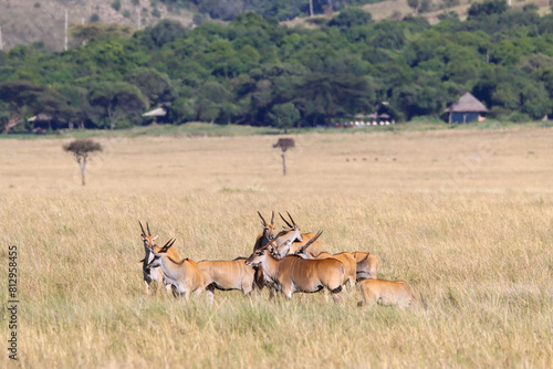 Naklejka premium Group of elands with the Kichwa Tembo camp in the background