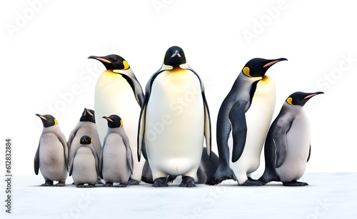 Fototapeta premium Group of Emperor Penguins on a white background. Generative AI.