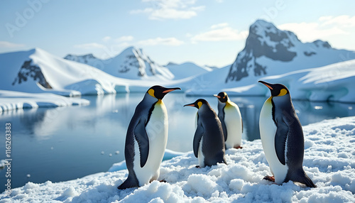 Fototapeta premium Group of emperor penguins on snowy landscape, symbolizing wildlife...