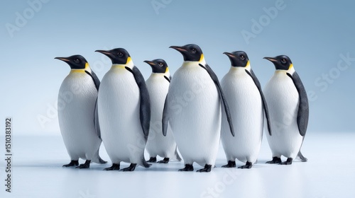 © Kittichet, Fototapeta premium Group of Emperor Penguins Standing Together on a Blue Background