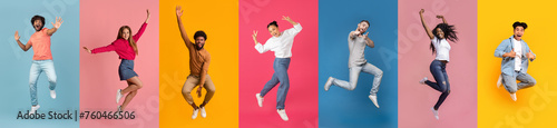 Fototapeta premium Group of energetic young people leap in the air, expressing happiness