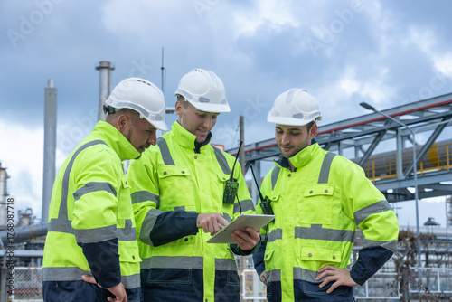 © eakgrungenerd, Obraz premium Group of engineer wearing safety uniforms and helmets discussing project on tablet in front of industrial gas tank. Concept of teamwork, refinery inspection, engineering collaboration safety.