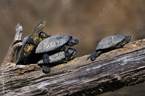 Obraz premium Group Of European Pond Terrapin Water Turtles Sunbathing On A Tree In The...