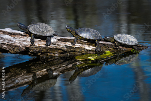 Obraz premium Group Of European Pond Terrapin Water Turtles Sunbathing On A Tree In The...