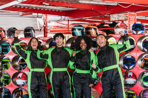 Obraz premium Group of excited friends in racing suits raising fists, celebrating a go kart victory or successful race at an indoor track
