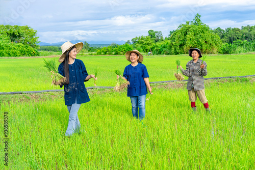 Fototapeta premium group of female asia farmers holding young rice sprouts talking joyfully...