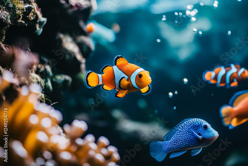 © Людмила Мазур, Fototapeta premium Group of fish swimming in a tank, one of which is orange and white. The tank is filled with coral and other sea life