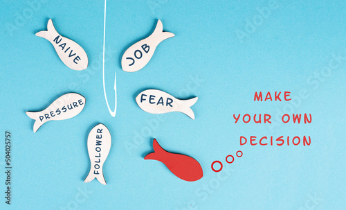 © Berit Kessler, Fototapeta premium Group of fishes with words like fear, pressure, follower swimming to the fishing rod, red fish makes his own decision, takes a different direction, against the stream