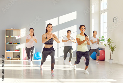 © Studio Romantic, Naklejka premium Group of fit and active female group doing sport exercises in gym. Happy smiling women in sportswear having workout indoors together. Sport training, exercising and fitness concept.