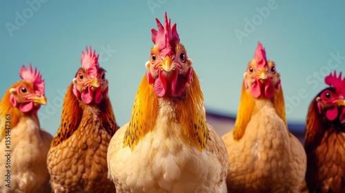 Fototapeta premium Group of five chickens are standing in a row, with one of them having a red...