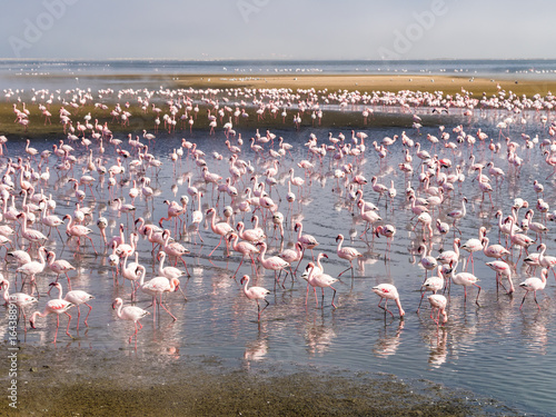 Naklejka premium Group of flamingos on Walvis Bay Lagoon.