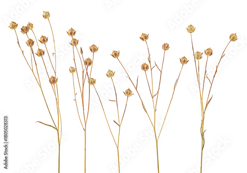 Fototapeta premium Group of flax spikelets isolated on a white background. Ears of flax. Beautiful dry flax plants.
