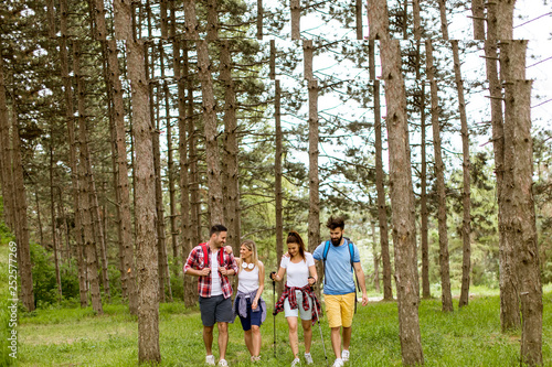 © BGStock72, Fototapeta premium Group of four friends hiking together through a forest