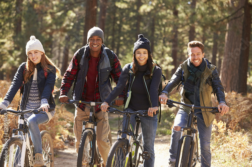 © Monkey Business, Naklejka premium Group of four friends on bikes in a forest looking to camera