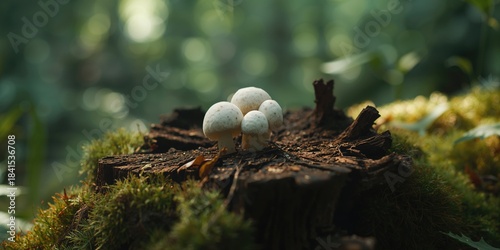 © AkuAku, Fototapeta premium Group of four pear-shaped puffballs growing on decaying wood, illustrating forest nutrient cycling, Earth Day