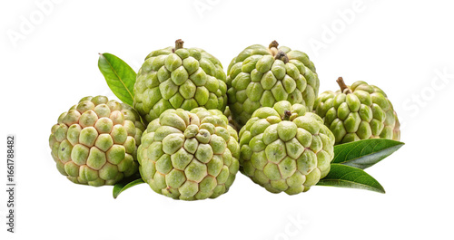 © MdRipon, Fototapeta premium Group of Fresh Green Custard Apples with Leaves on White Background