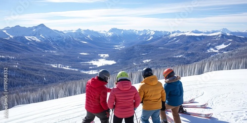 © Chalermrach, Fototapeta premium Group of friends enjoying a day of skiing in the picturesque Chic-Chocs mountains in Quebec, Canada under a clear blue sky, skiing, Canada