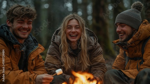 Fototapeta premium Group of Friends Enjoying Campfire in Forest During Winter Evening