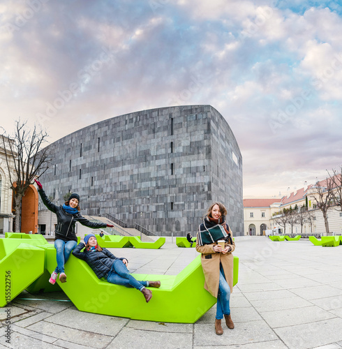 Fototapeta premium Group of friends having fun and sitting on the bench at park in Vienna
