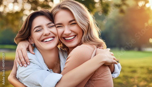 © anandart, Fototapeta premium Group of friends having fun together outdoors, space for text