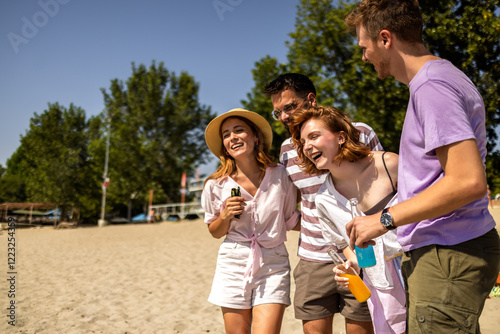 Fototapeta premium Group of friends is smiling, dancing, having fun and they drink cocktails at the beach on a sunny day.