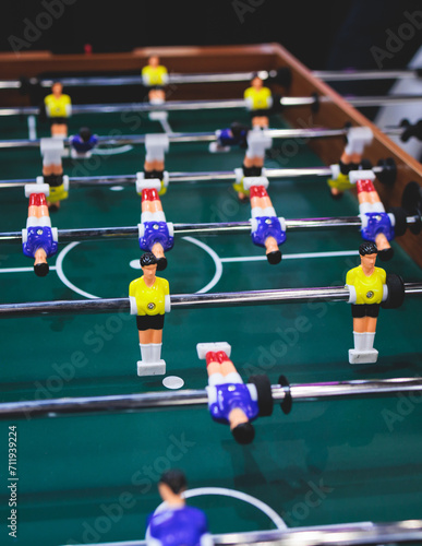 Fototapeta premium Group of friends playing kicker in a sports bar room, colleagues teammates play table football, table soccer game in the office, having fun, tabletop football match competition at work