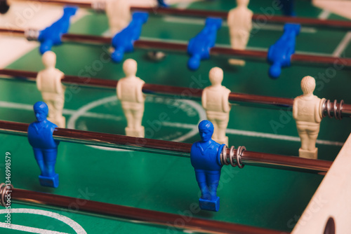Fototapeta premium Group of friends playing kicker in a sports bar room, colleagues teammates play table football, table soccer game in the office, having fun, tabletop football match competition at work, backyard games