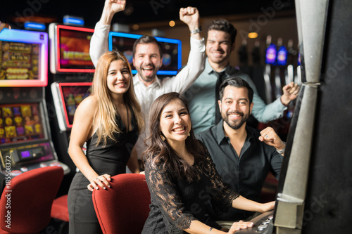 Fototapeta premium Group of friends playing slots in a casino