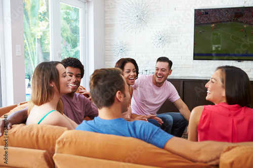 Fototapeta premium Group Of Friends Sitting On Sofa Watching Soccer Together