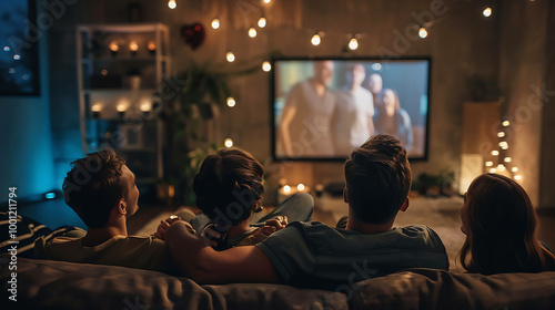 © Elnare, Obraz premium Group of friends watching a movie in a cozy living room setting.