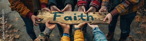 © Naret, Obraz premium Group of friends with hands joined around a "Safety Promise" sign, safety, community support.