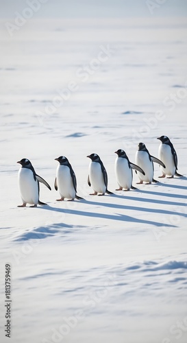 Obraz premium Group of gentoo penguins marching in snowy Antarctica