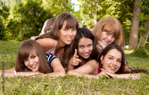 © Andriy Petrenko, Fototapeta premium group of girls teenagers in park on grass