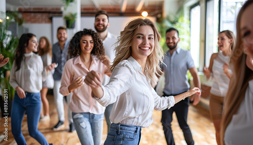 Obraz premium Group of happy adult people dancing modern social dances in pair at dance school