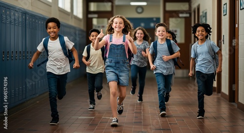 Fototapeta premium Group of Happy Elementary School Children Running Down a School Hallway, Ready for Fun and Learning