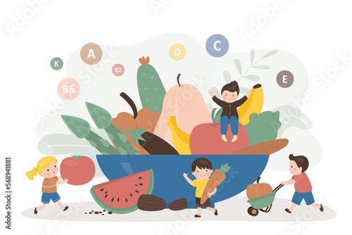 © Marina, Obraz premium Group of happy healthy kids, proper nutrition. Big plate with vegetables and fruit mix. Food containing many useful vitamins, nutrition for growing organism. Green fresh, organic nutrition