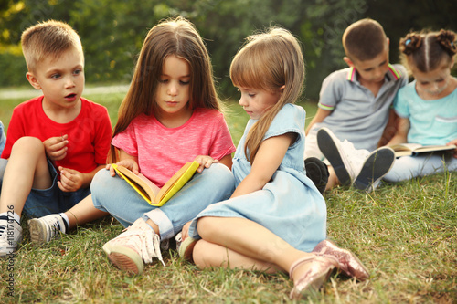© Africa Studio, Fototapeta premium Group of happy kids reading books in park